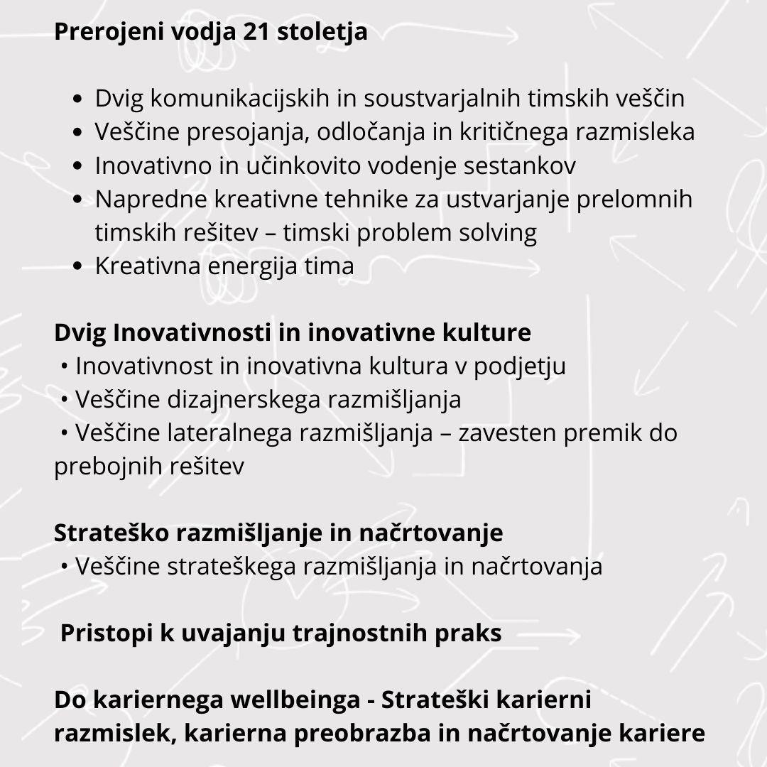 S preizkušenimi pristopi vam pomagamo trenirati veščine, s katerimi boste navdušili sodelavce, nadrejene in poslovne partnerje. Skupaj bomo gradili sodelujoče in soustvarjalne inovativne ekipe, ki bodo z navdušenjem snovale, inovirale procese in oblikovale nove produkte.