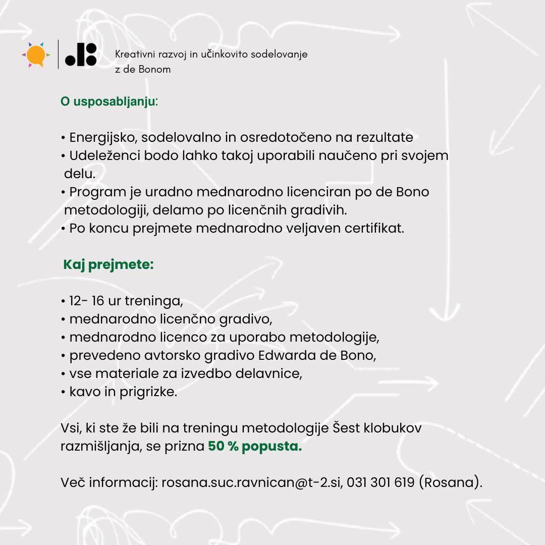 Če bi si to želeli, morate za to pridobiti trenersko licenco, za kar se obrnite na master trenerko in distributerko de Bono metod razmišljanja Nastjo Mulej na info@nastjamulej.com.